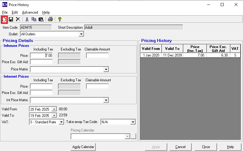 To enter the new prices click on the ‘New’ Icon (the blank sheet of paper) where shown.