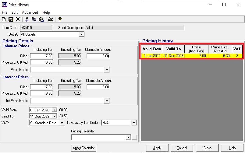 In the ‘Price History’ screen, the current prices and any ‘Price Breaks’ that have already been set up will be shown. In the example below, the current price is set to £7 with gift aid and £6.30 without gift aid. But a there is going to be a price change so we need needs to apply new prices to this PLU for a different date range (a 'Price Break'). The process of creating a new ‘Price Break’ is explained below.