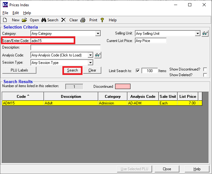 The ‘Search’ button was then clicked to bring up the list of PLU’s found (in this case just one PLU).