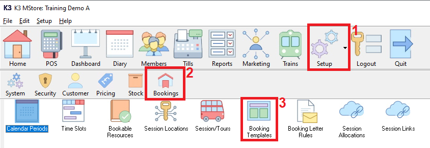 1. click on ‘Setup’, 2. then click ‘Bookings’ and then 3. double click ‘Booking Templates’.