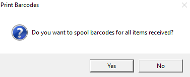 A prompt will appear asking if you ‘want to spool barcodes for items received’.