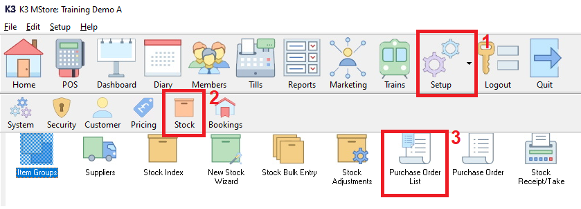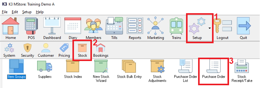 Click on 1. the ‘Setup’ Icon, next 2. click ‘Stock’ Icon, then finally 3. double click the ‘Purchase Order’ icon.