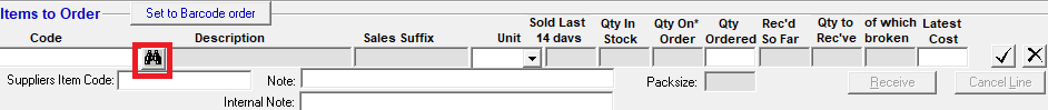 You can begin to add stock items onto your purchase order by using the ‘Search’ icon, located in the ‘Items to Order’ section of the ‘Purchase Order Entry’ screen.