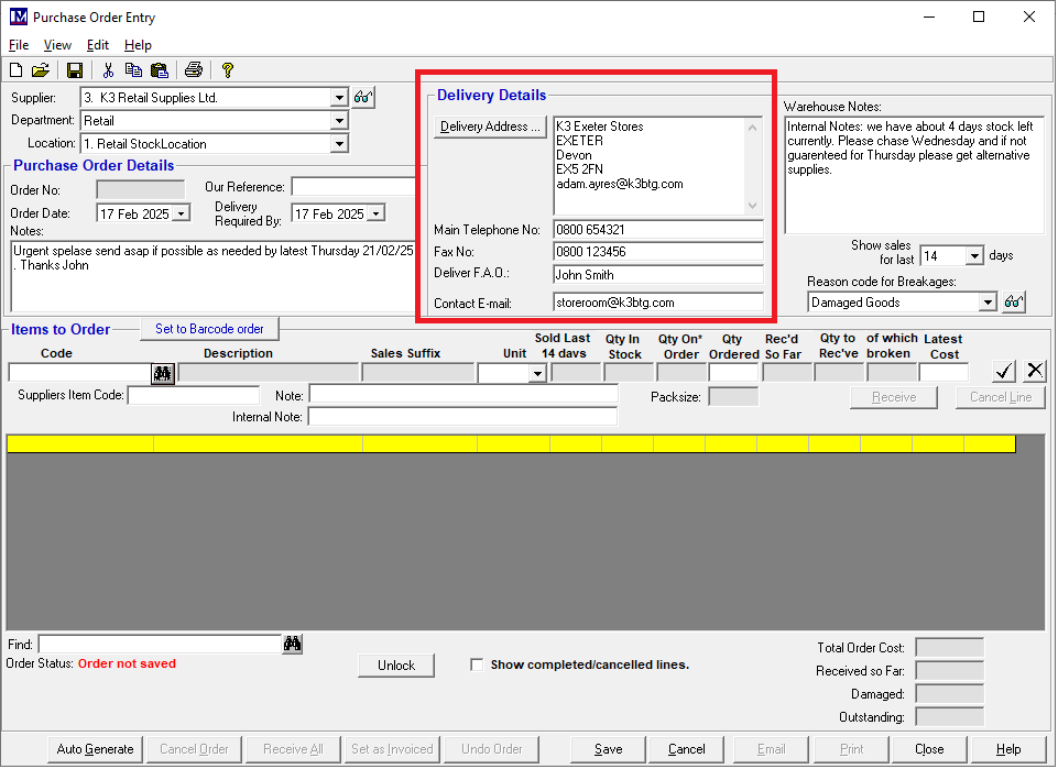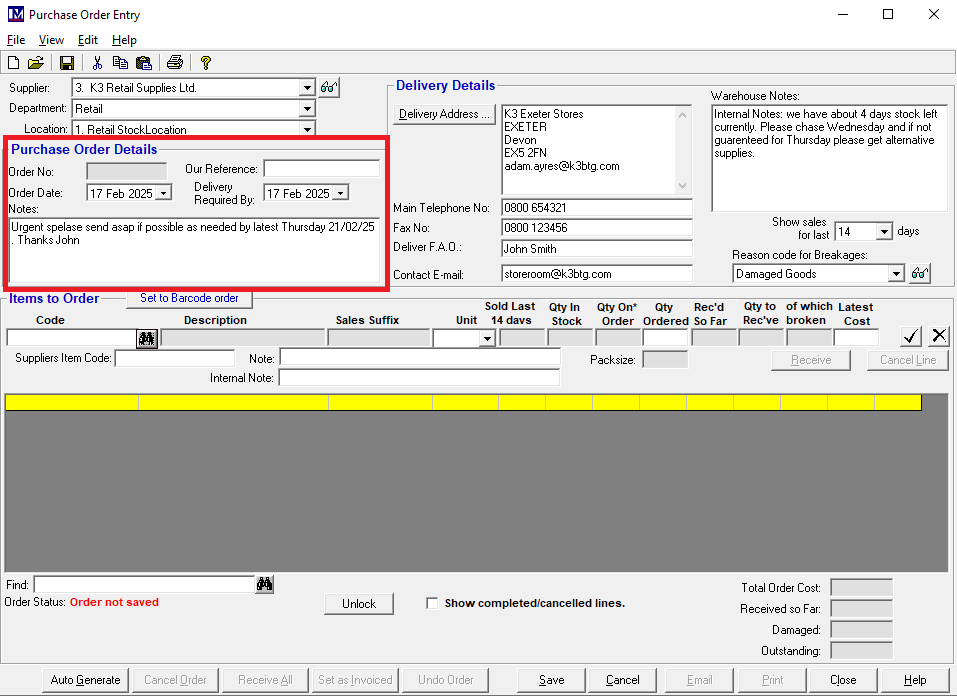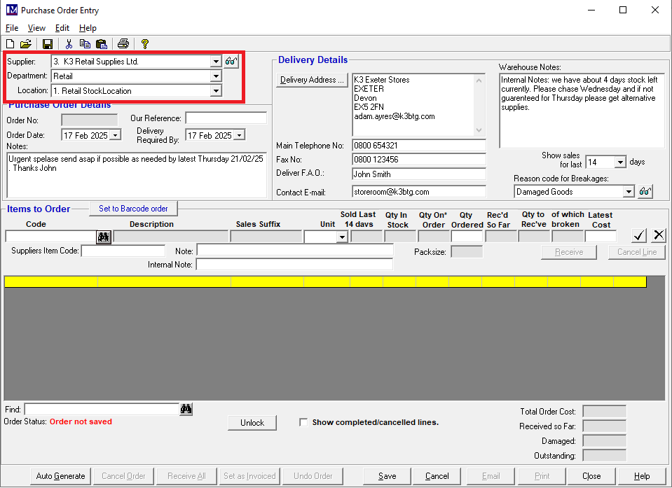 The first step when creating a purchase order is to ensure all supplier and recipient details are correct within the ‘Purchase Order Entry’ Screen. This is done by filling in all the detail fields highlighted in the following pages