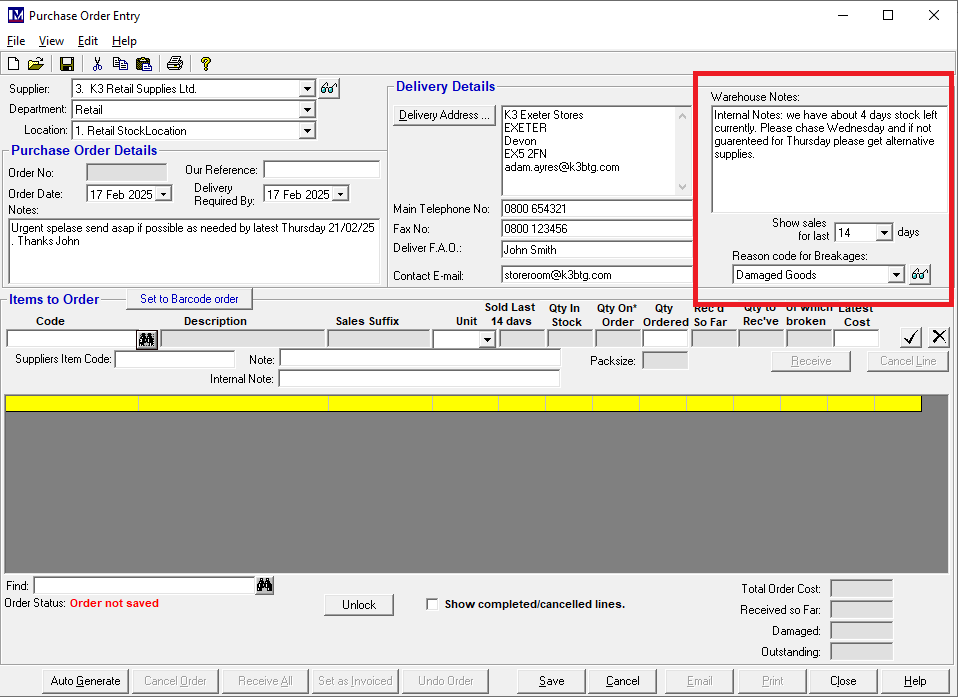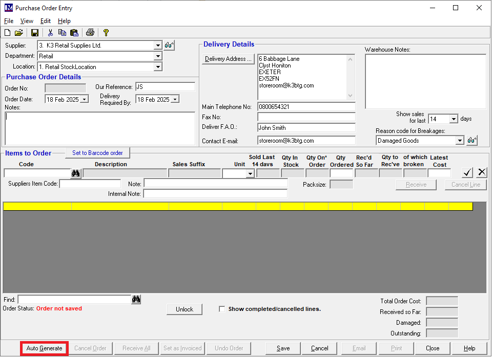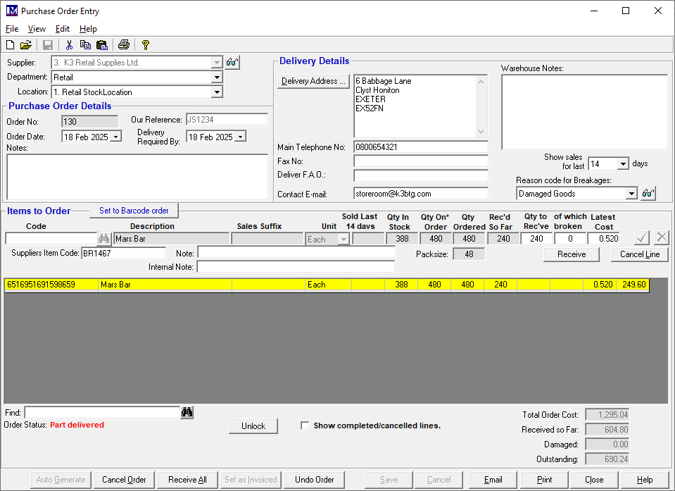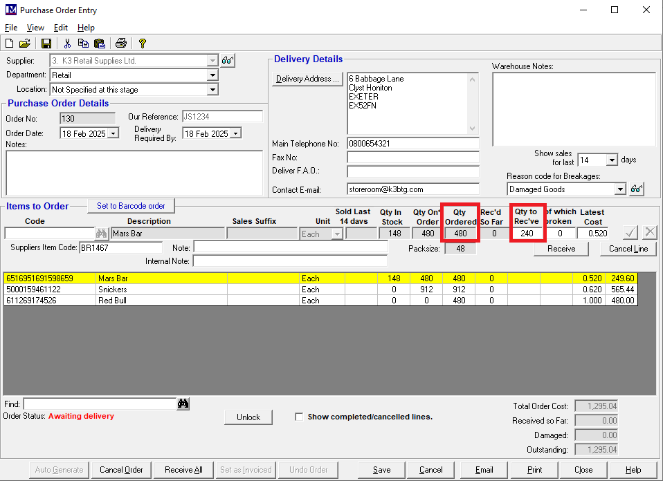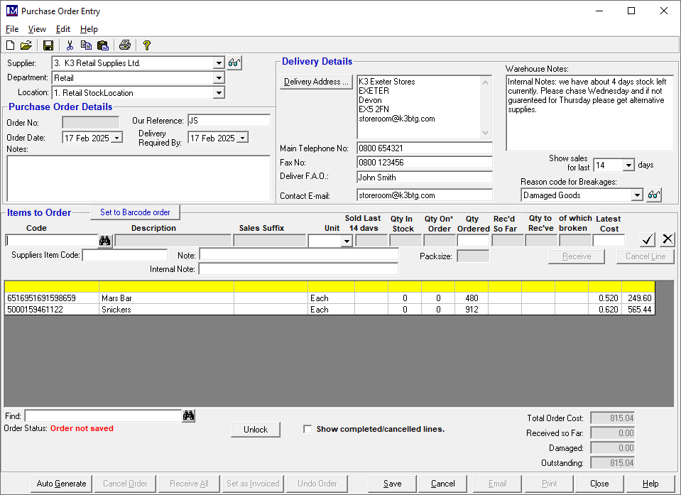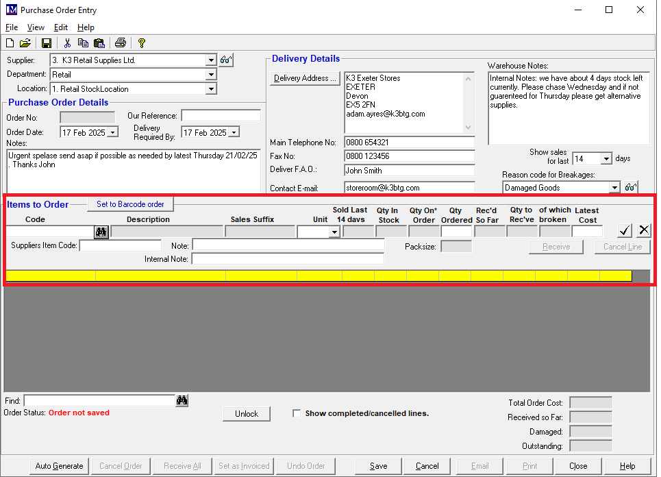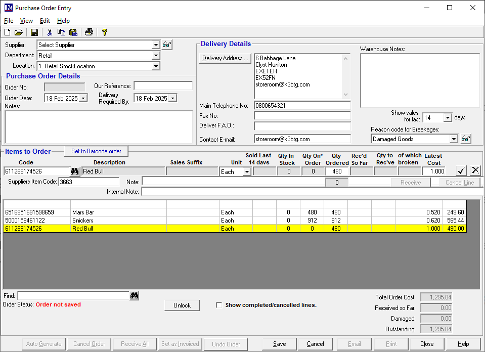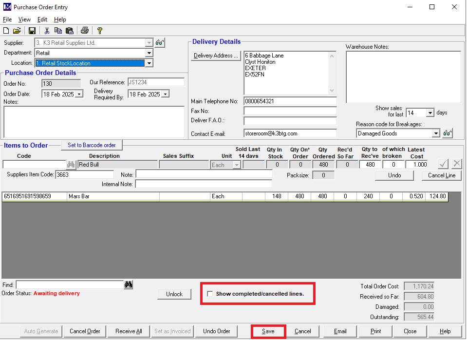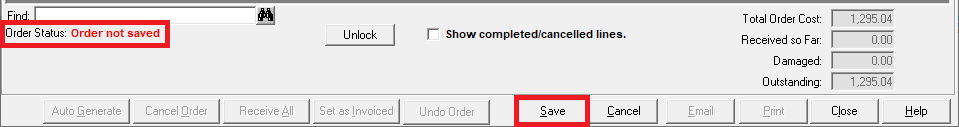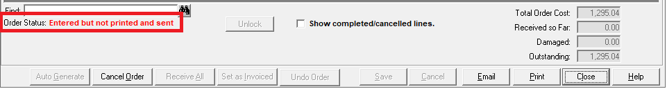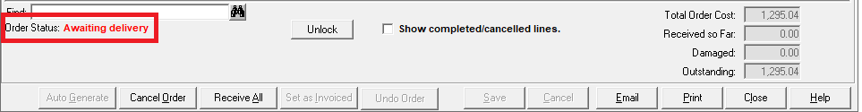 Once unlocked you can then add or deduct stock items from the Purchase Order as before. When you have completed any amendments, simply click ‘Save’ again. The you will need to again repeat the above process to wither Email or Print the order, when it will go back to "locked" and the 'Order Status' goes back to 'Awaiting Delivery'.