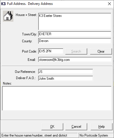 This will open the delivery address input screen shown below. Enter the data as required, then click ‘Ok’.