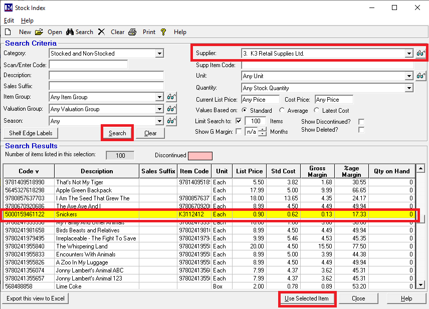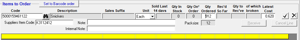 Click on the stock item you wish to add to your purchase order, so it becomes highlighted.