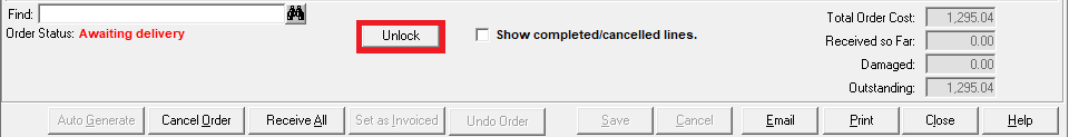 Please note if you need to amend a locked purchase order, you can unlock it by clicking ‘Unlock’. Again this requires your Merac 'User' to be in a 'Security Group' with the correct permission to do this.