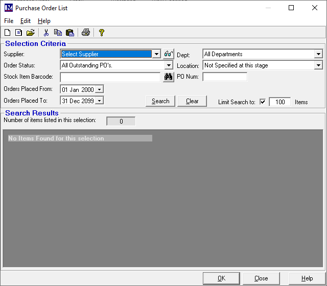 However if you simply click 'Search', the default selection criteria will find all 'Outstanding' purchase orders.