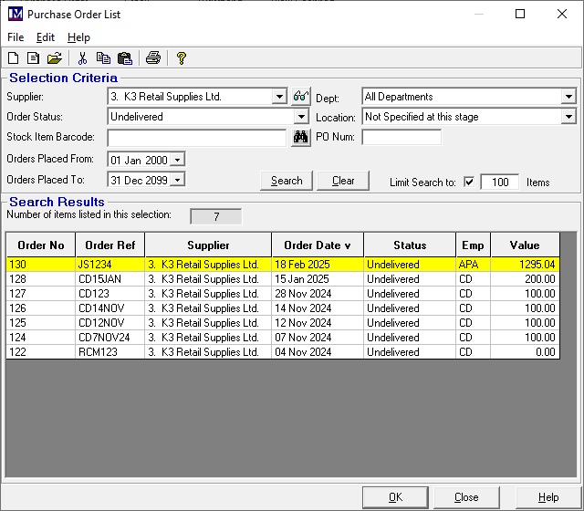 Once you have created any purchase order and got as far as saving that purchase order, or any stage beyond saving then all purchase order history can be found in the 'Purchase Order List' option. So to find any order that meets the above criteria, e.g. the order you just placed that was status 'Awaiting Delivery' you need to be in the 'Purchase Order List' option.