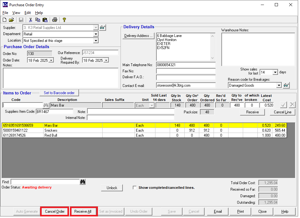 You can now cancel / amend / receive each line as required and detailed in the previous sections.