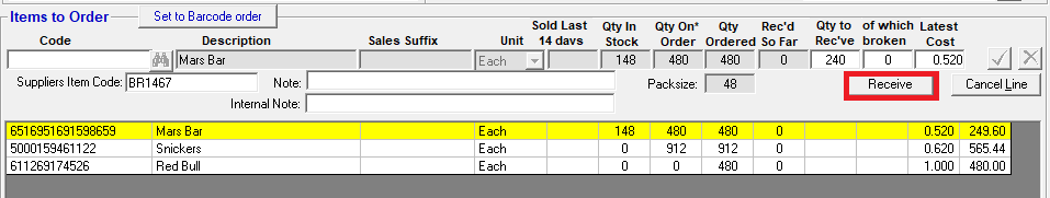 In this case there is only one item in the order ‘Receive All’ can be clicked to receive all remaining items.