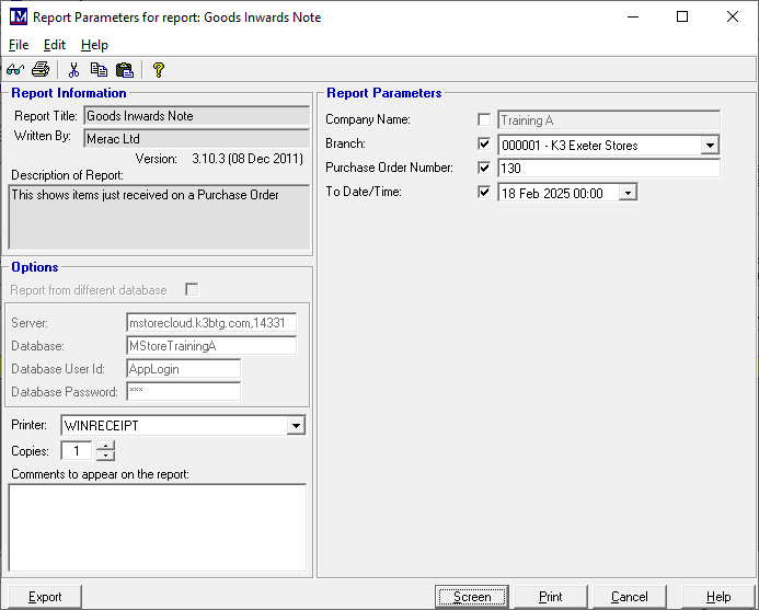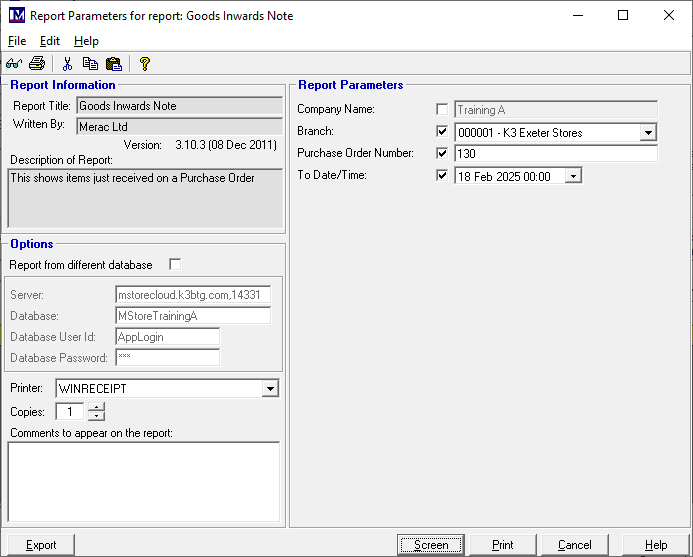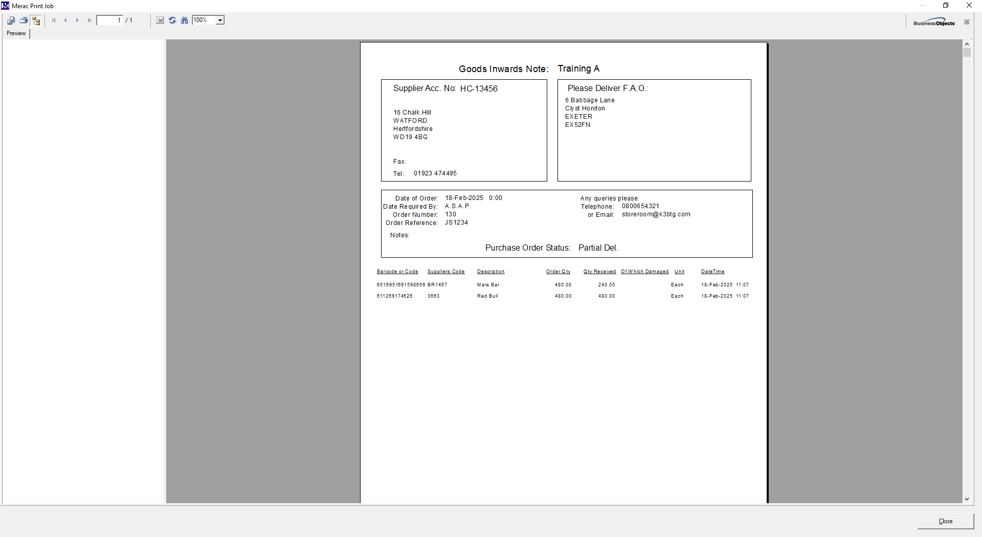 (1) If you clicked 'Print' this will open the Merac purchase order report which can be printed in the usual way.