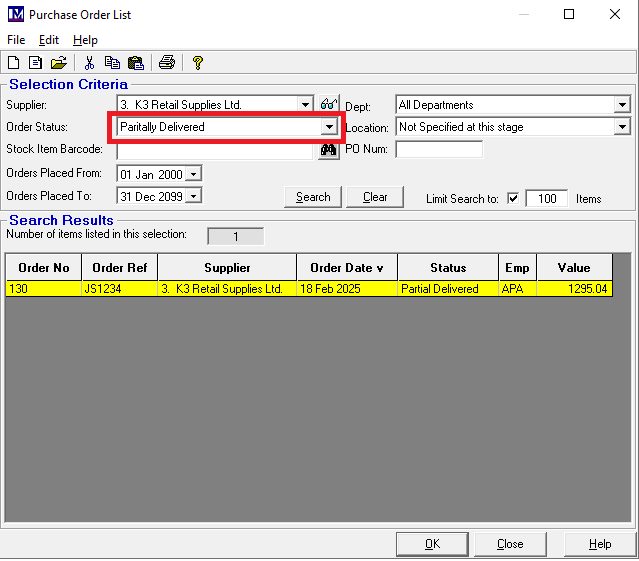 Select the status 'Partially Delivered' will assist finding a partially delivered order quickly.