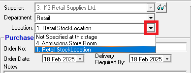 Select the specific ‘Department’ that is raising the Purchase Order from the dropdown menu. N.B. this can then be used later to filter existing orders by a specific ‘Department’, when looking for existing orders in the ‘Purchase Order list’ screen.