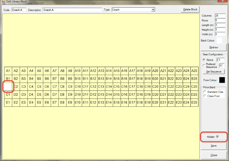 Next click the ‘Hidden’ tick box and the seat will turn white (indicating the seat is hidden).
