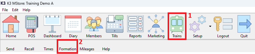 1. Click the ‘Trains’ main menu option, then 2. click on the ‘Formation’ button.