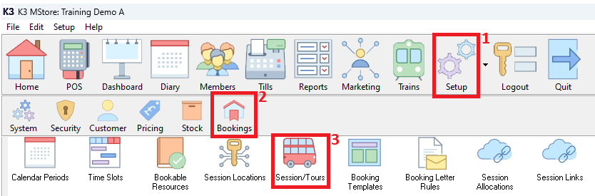 Click 1. 'Setup', then 2. click 'Bookings', then 3. finally, double click 'Sessions/Tours'.