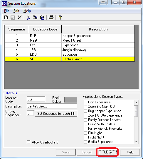 Repeat the above steps if more ‘Session Locations’ are required, otherwise click on ‘Close’.