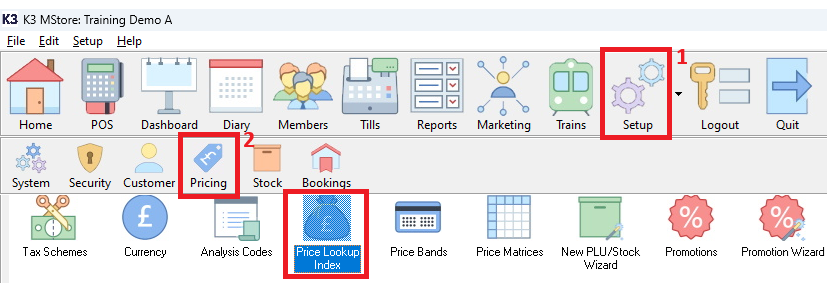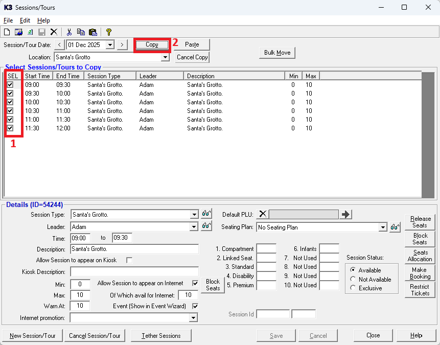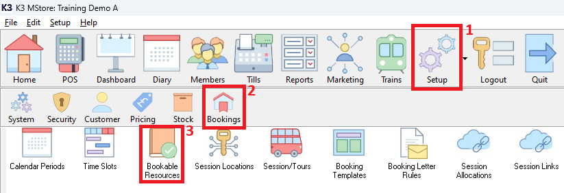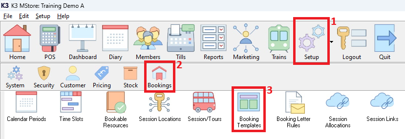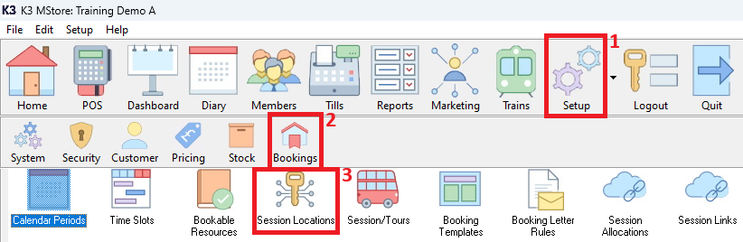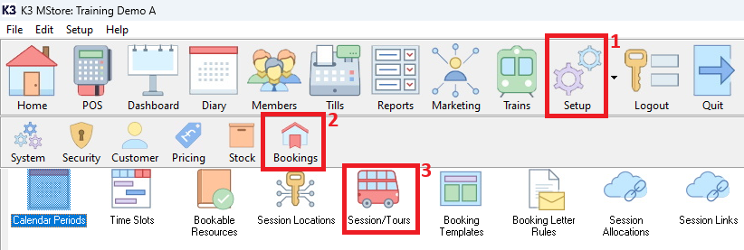 To create a new Session 1. click Setup then 2. click Bookings then 3. double click on Sessions/Tours.