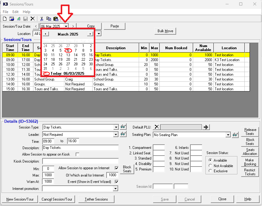 Now, select the date of the first session using the ‘Session/Tour Date’ dropdown.