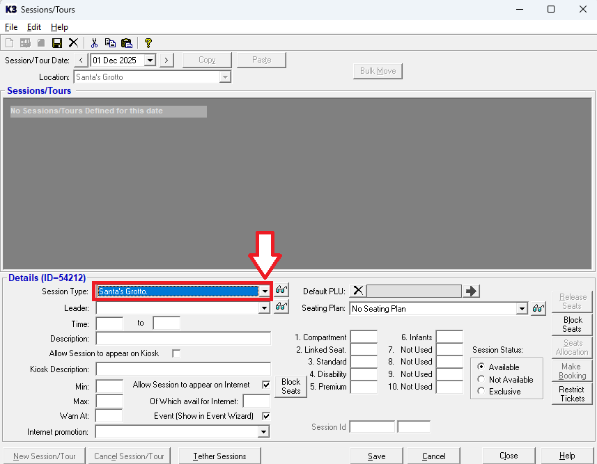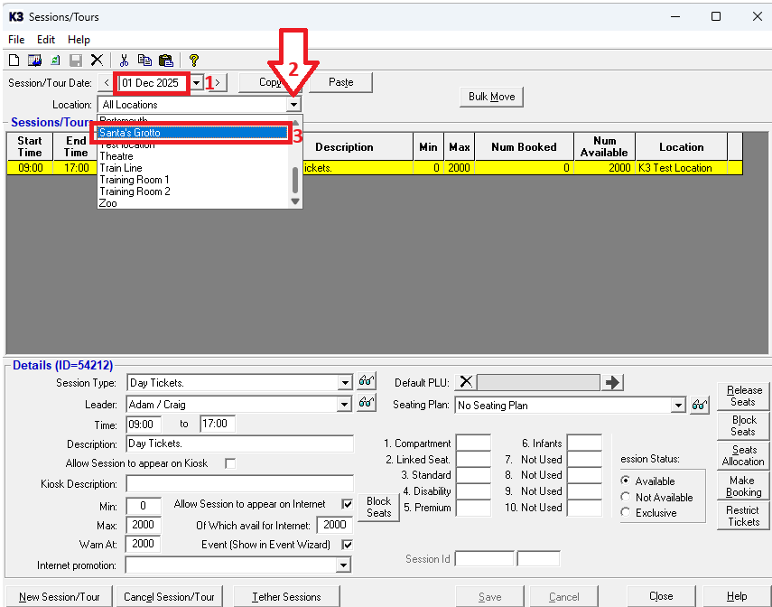 2. Next click the ‘Location’ dropdown selector and 3. select the required 'Session Location' (e.g. 'Santa's Grotto')