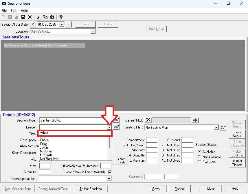 Now select the required session ‘Leader’ from the relevant dropdown selector.