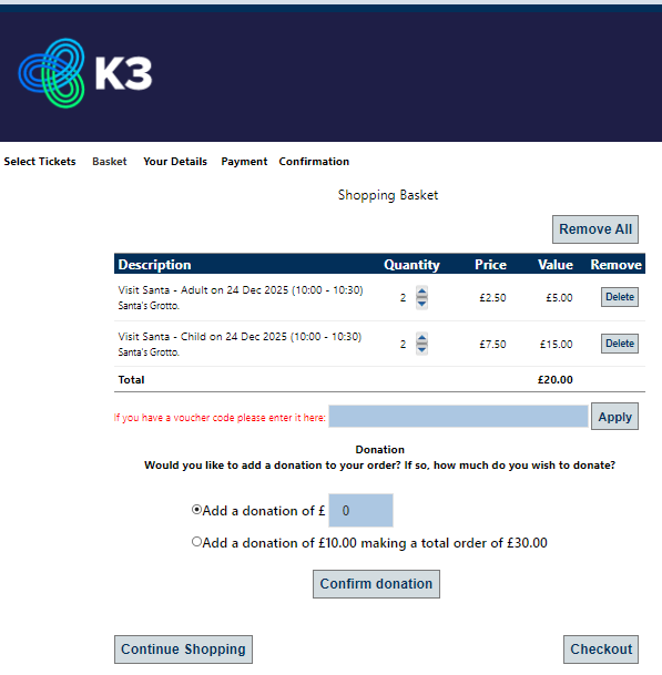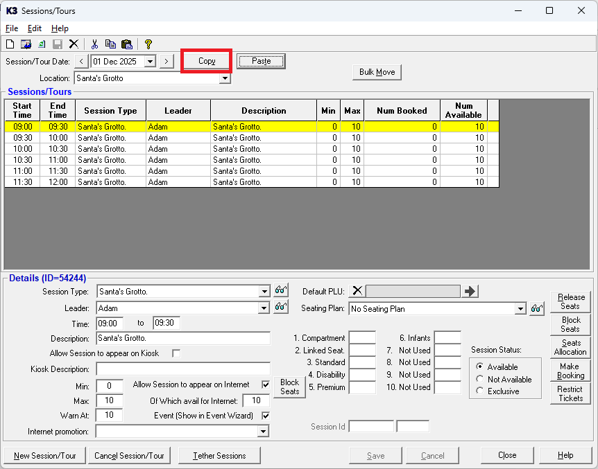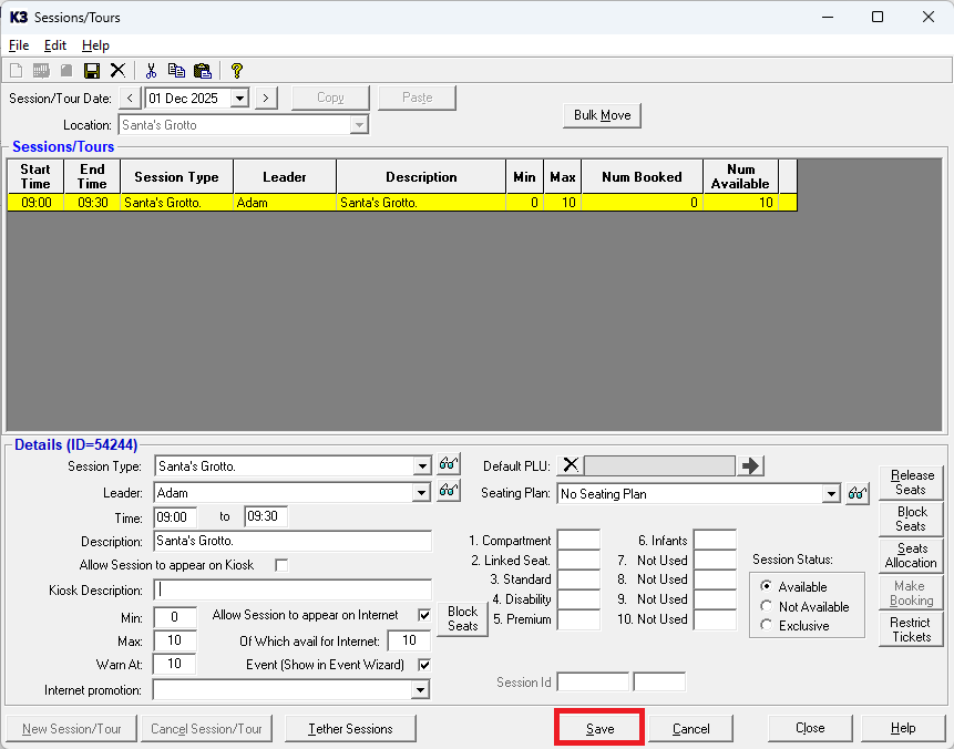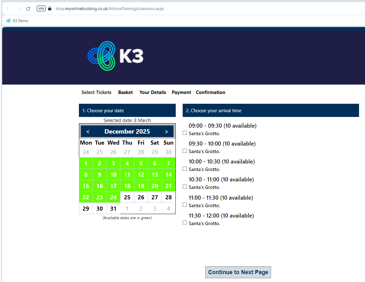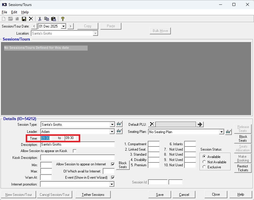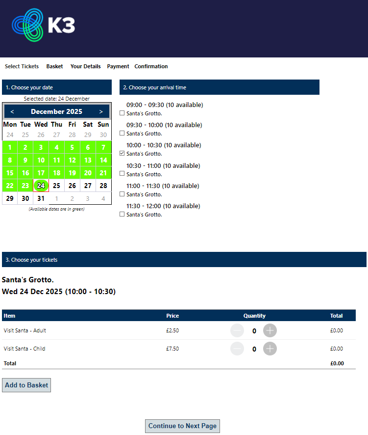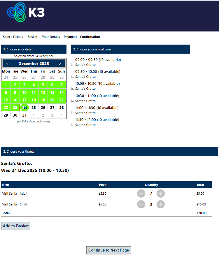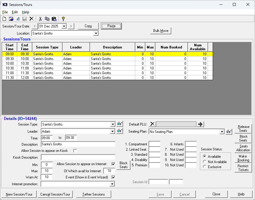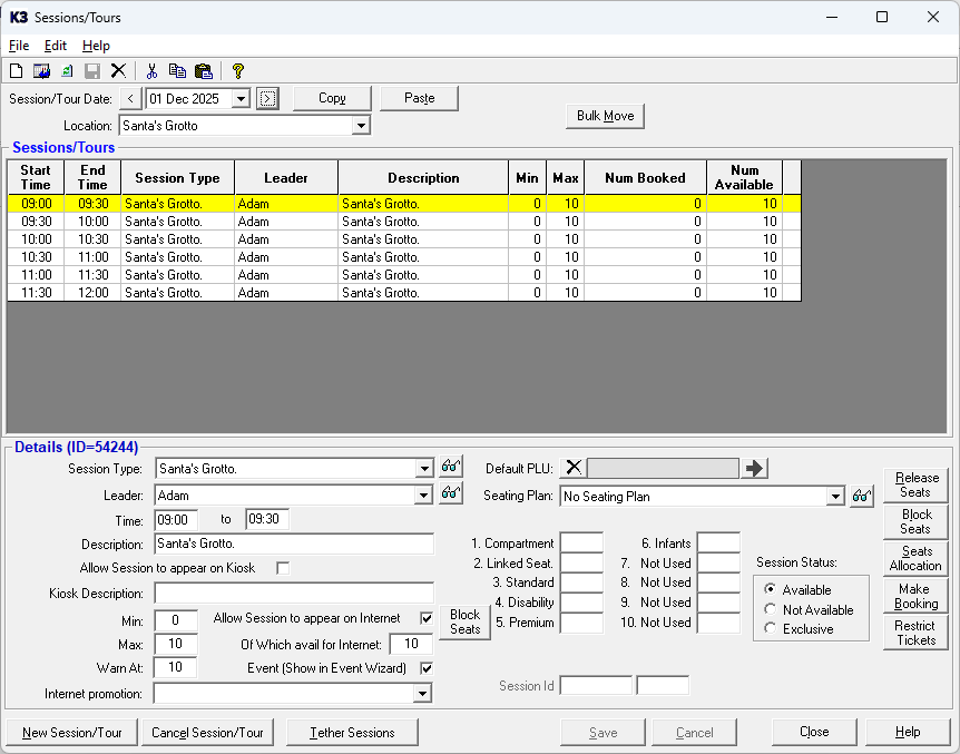 For example, the Santa’s Grotto ‘Session’ runs every 15 minutes from 9:00 am until 4:00 pm.