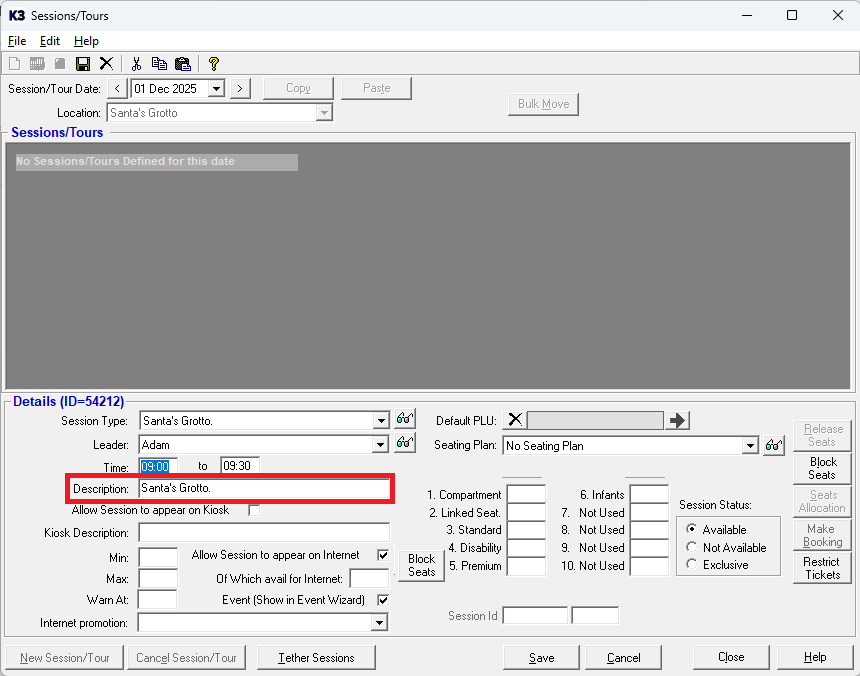 Please note the ‘Description’ box defaults to the same as the ‘Session Type’.