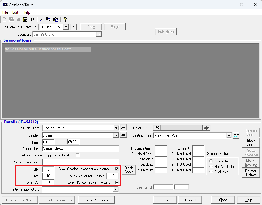 In the till and back office there is a Session specific booking tool called the 'Event Wizard'. For sessions to be bookable in the till / back office software using the 'Event Wizard' then click the ‘Event (show in Event Wizard)’ box, so it is ticked.