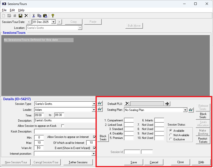 Setting up sessions that require seat booking are outside the scope of this user guide