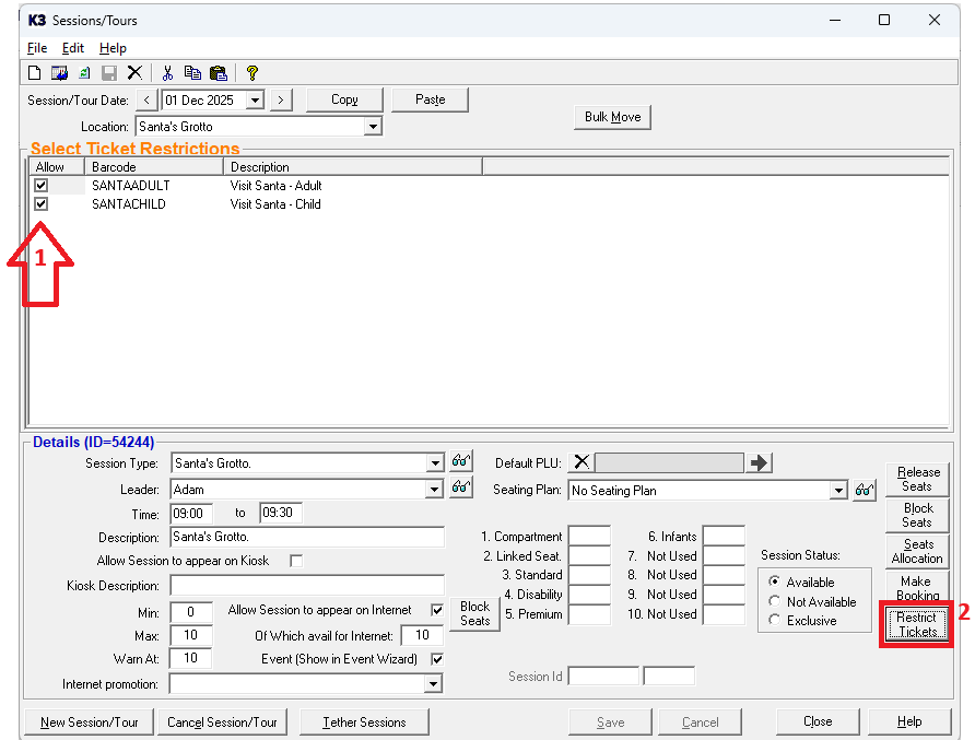 1. Clicking on the 'Restrict Tickets' button for a specific session time takes you to the below screen.