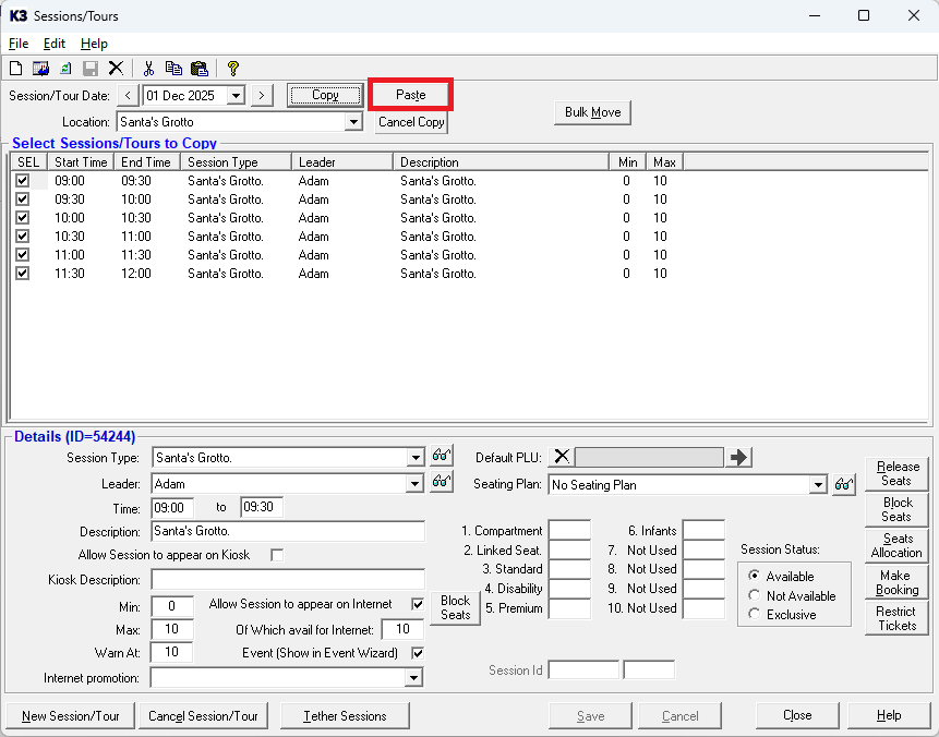 For example, the ‘Santa’s Grotto’ session might happen in both the ‘Garden Centre’ and the ‘House’.