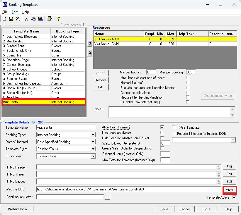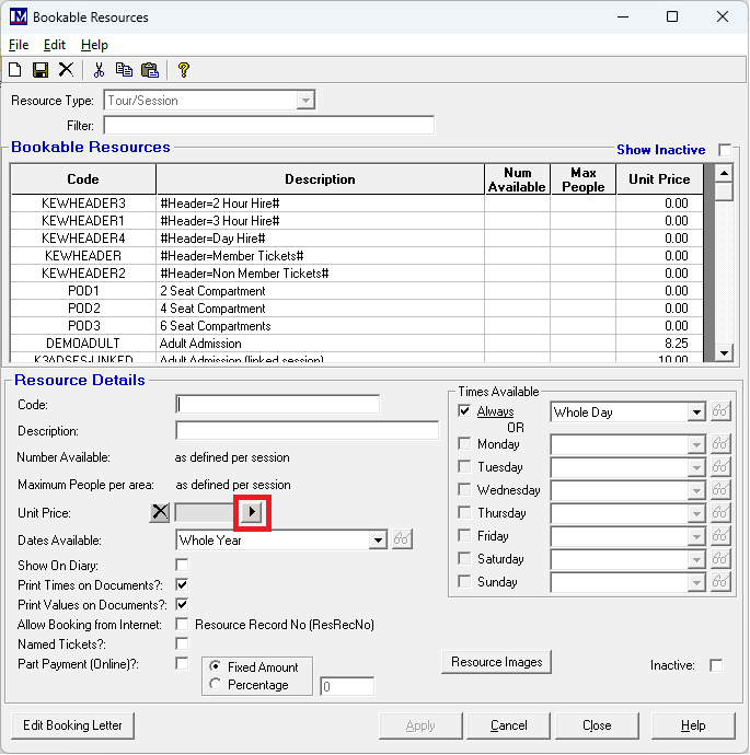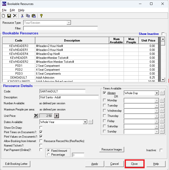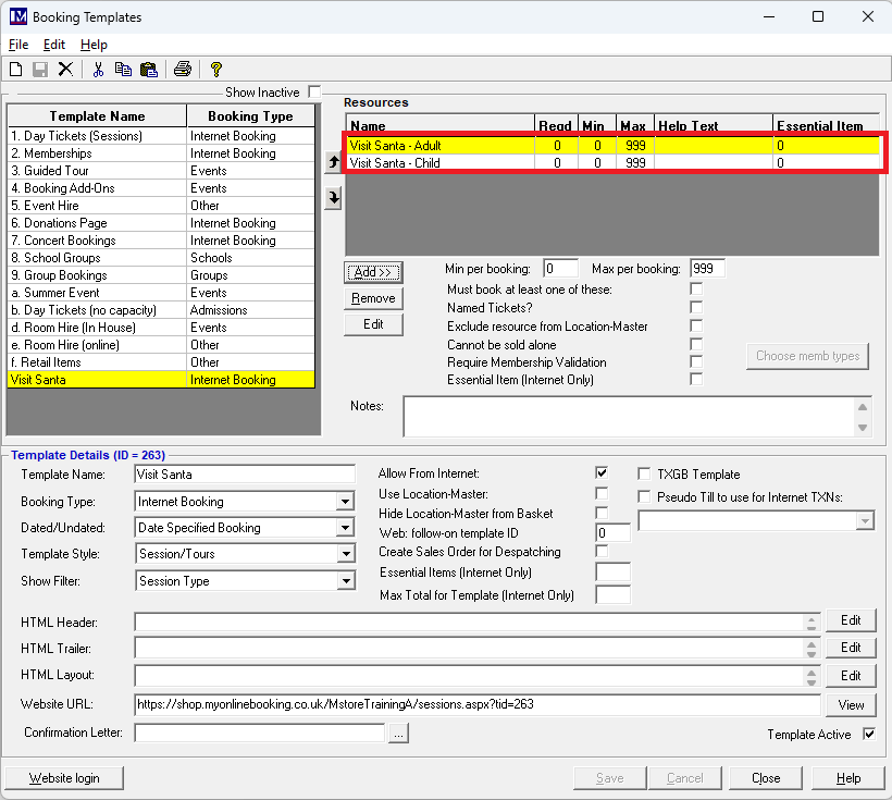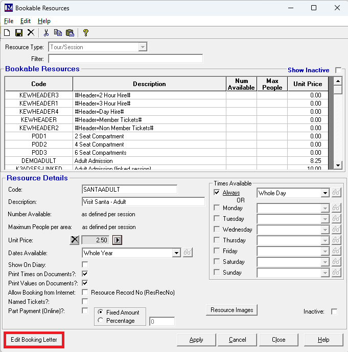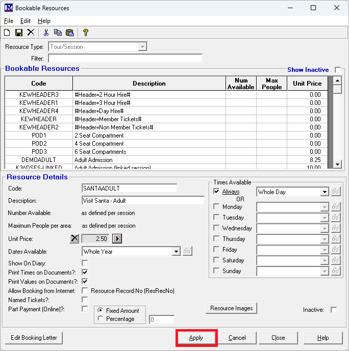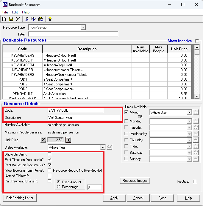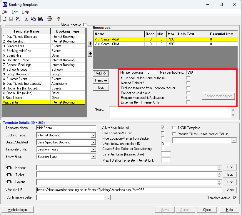 There are set per 'Bookable Resource' i.e. each "ticket" type can have different settings). Please note these settings only apply to online ticketing web pages, they do not apply to bookings made "in-house" (using the Merac till or back office software) To apply these you first need to click on a specific 'Bookable Resource' so that it is highlighted, then the settings can be applied. These settings referred to and shown on the screenshot and are detailed below.