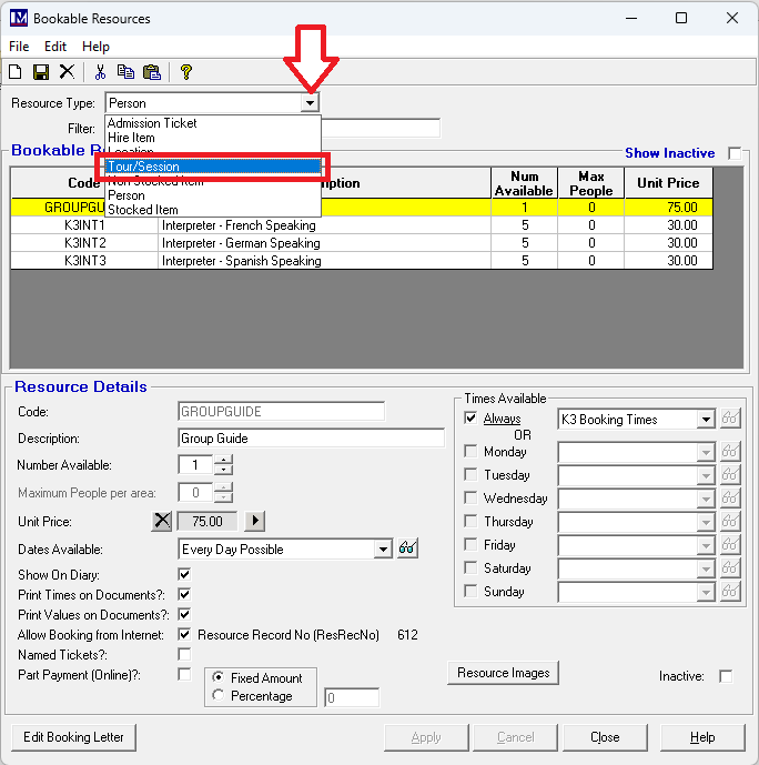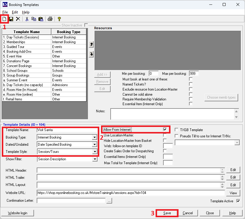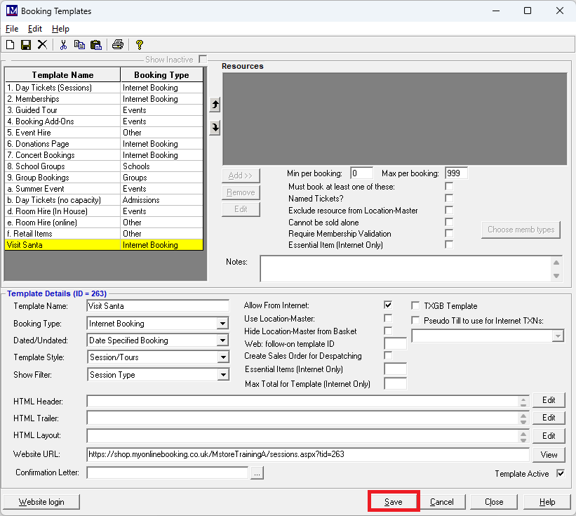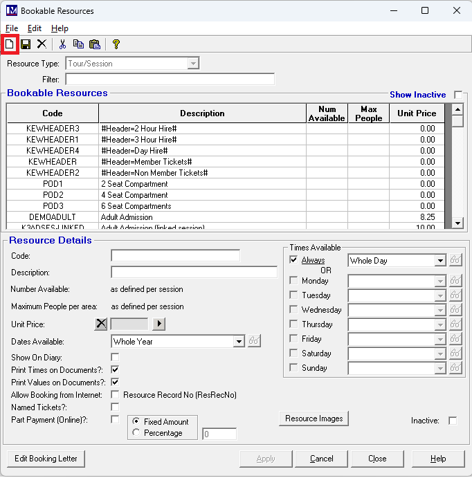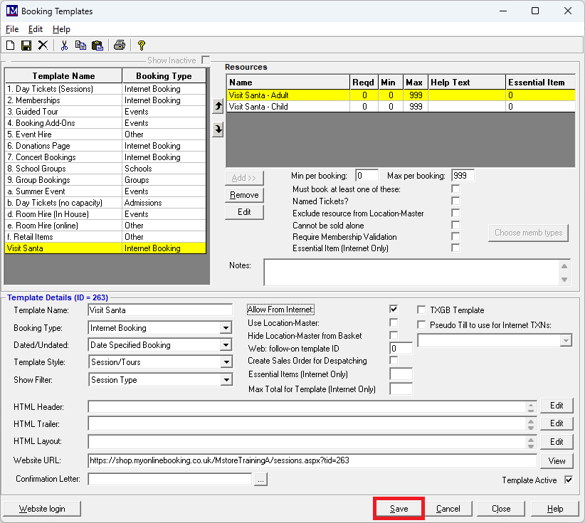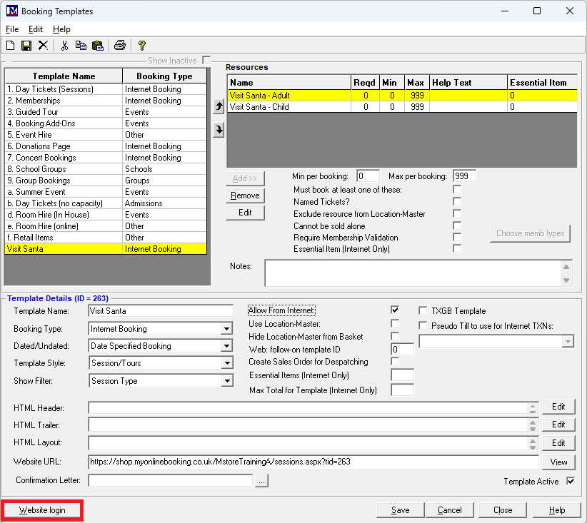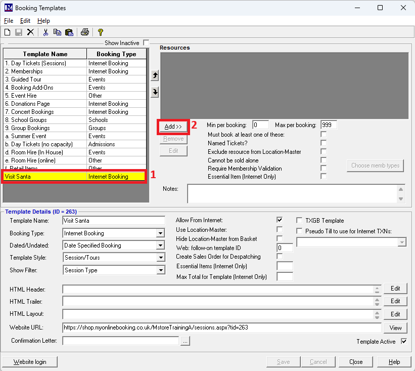 There are set per 'Bookable Resource' i.e. each "ticket" type can have different settings). Please note these settings only apply to online ticketing web pages, they do not apply to bookings made "in-house" (using the Merac till or back office software) To apply these you first need to click on a specific 'Bookable Resource' so that it is highlighted, then the settings can be applied. These settings referred to and shown on the screenshot and are detailed below.