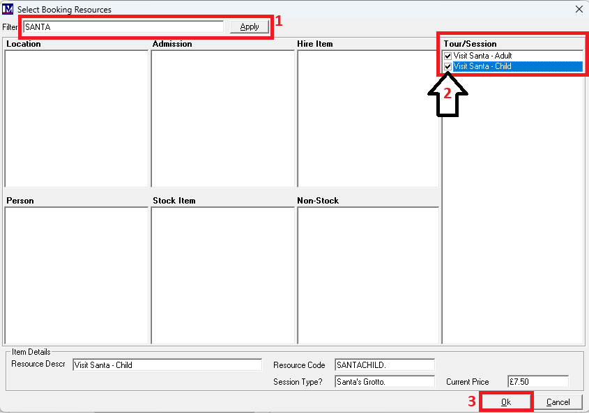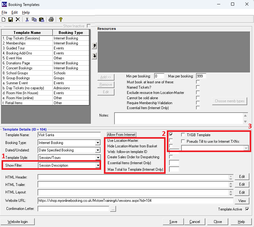 This is assigned using the dropdown selector where shown in 1. on the above screenshot. The 'Session Filter' for this scenario needs to be set to 'No Filter'. This would only be used where there are 'Bookable Resources' in a single 'Booking Template' that are linked to multiple 'Session Types'. This would not be used by the majority of customers and would only often be used by e.g. heritage railways. This is because such attractions might offer multiple different sessions for the various different train journeys that may have been set up as different 'Sessions Types'. Such attractions may want to offer these via one online booking template (web page). So this is a scenario a "filter" is often required to assist the customer user experience.