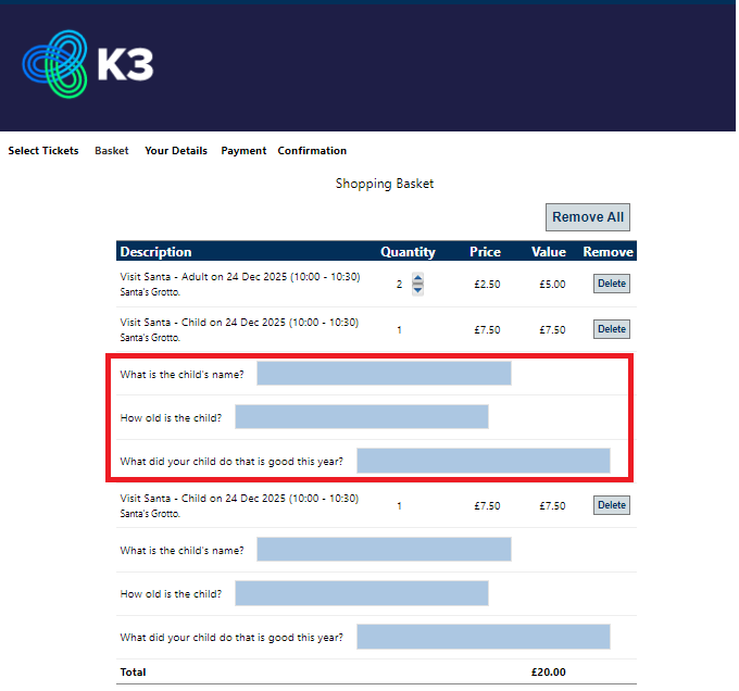 If required there is also the ability capture extra data when selling specific items, this is know as PLU 'Data Capture' where up to 5 questions can be asked (per item) when it is sold. An example of how this looks is shown below and it is useful in events such as 'Visit Santa' type events where additional is required an is mandatory. However, please note the data can be set to not mandatory for other purposes as required. Data capture can also be set up and used for "in-house" Merac bookings.