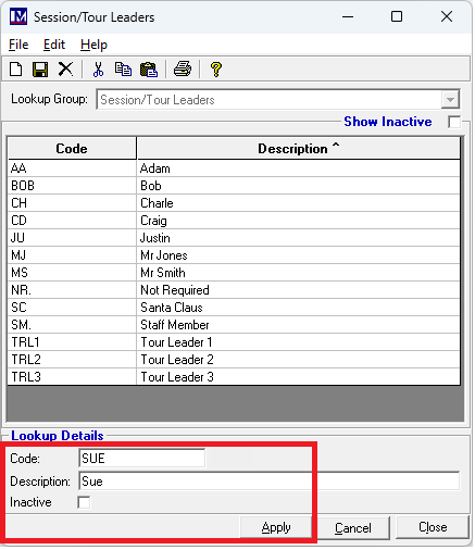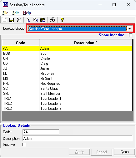 In the ‘Lookup Items’ window, click on the ‘Lookup Group:’ dropdown and select ‘Session/Tour Leaders’.