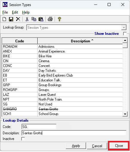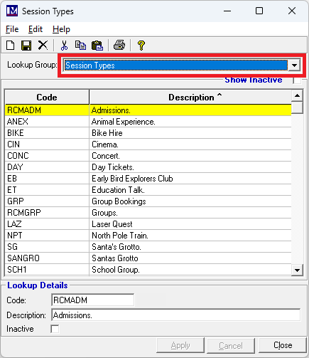 In the ‘Lookup Items’ window, click on the dropdown next to ‘Lookup Group:’ and select ‘Session Types’.