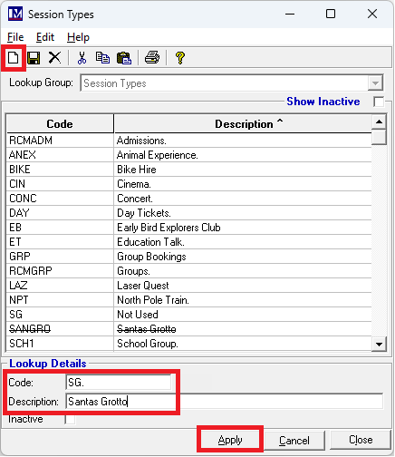 Next enter a ‘Code’ and ‘Description’ for the new ‘Session Type’ and click ‘Apply’.