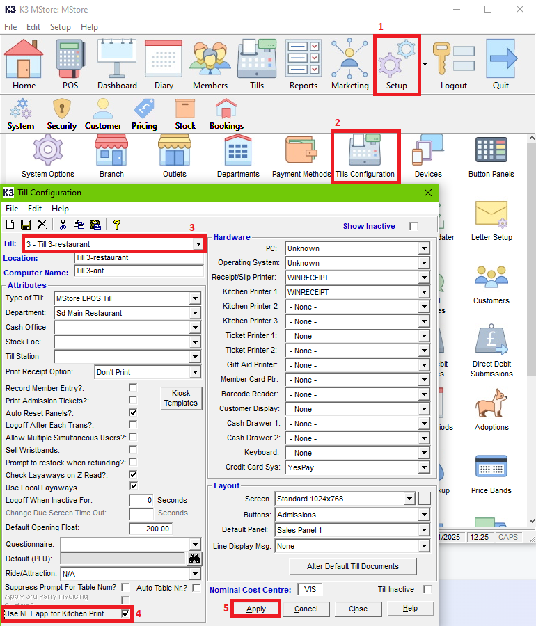 - Within the Till Configuration screen, choose the till (3) you would like to enable .Net kitchen printing, then tick Use .Net app for Kitchen Print (4), then Apply (5).