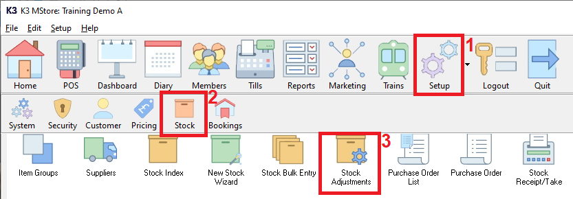 First 1. click on ‘Setup’ then 2. click on ‘Stock’ then 3. double click on ‘Stock Adjustments’.