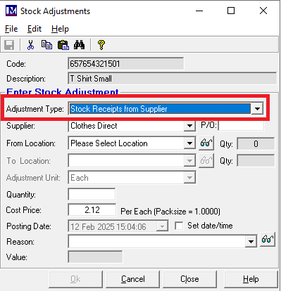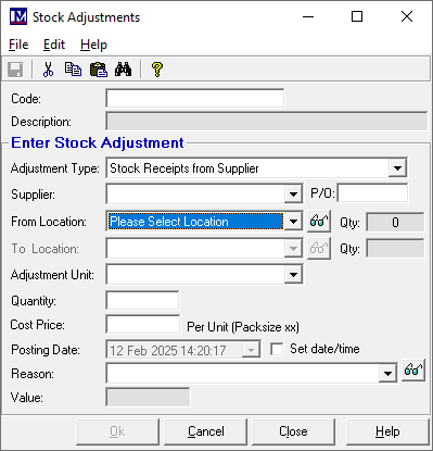 This functionality can be used to deliver stock, so that it is added to your stock holding for a specific stock location. Although this is a simple way of entering deliveries into the 'Merac’ software, this does require deliveries to be entered an item at a time. There is also no way of reviewing the previous stock adjustments made in this screen, or to e.g. associate all the stock items delivered as being part of one "delivery note".