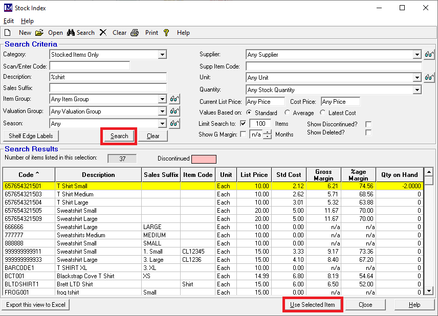 Click on the required stock item so it is highlighted yellow, then click the ‘Use Selected Item’ button.