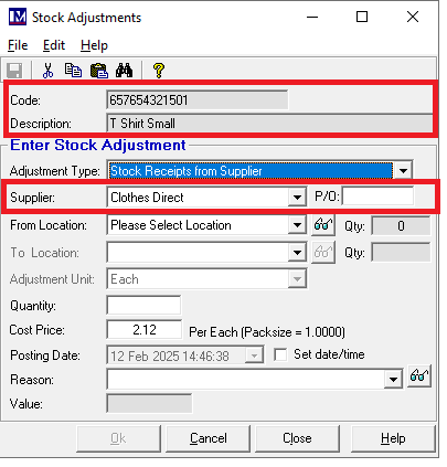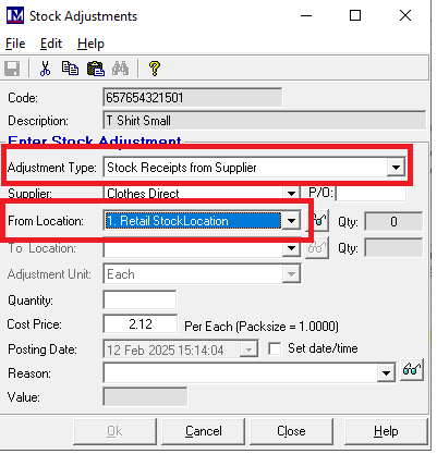 Please note at this point if this stock adjustment is to be posted for the current date / time then click the 'Ok' button.
