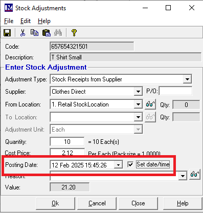However, if you want to record the stock adjustment for a different date / time do not click the 'Ok' button.
