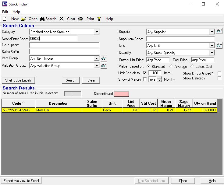 Show Discontinued: Tick as required if you want the search to include ‘Discontinued’ stock items.