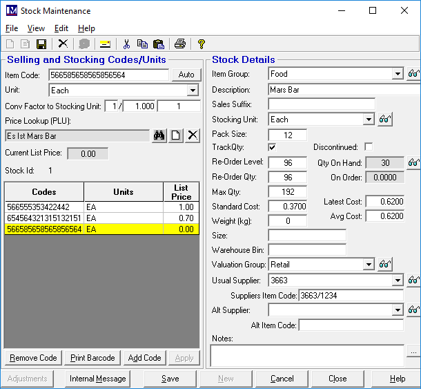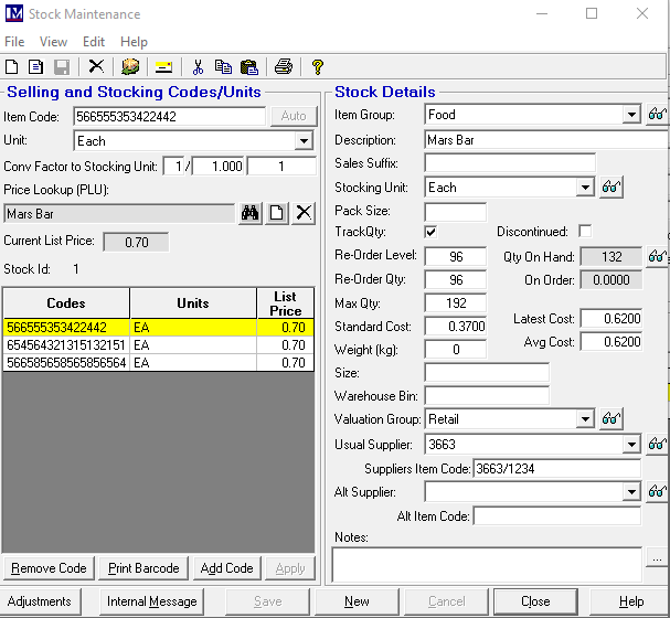 This screen shows the codes / barcodes currently used to sell this stock item. In the above example, you will notice there are 3 barcodes for this stock item. This can be the case where exactly the same product is delivered but e.g. the manufacturer's barcode on the packaging has changed. In this scenario the new barcodes need to be added.