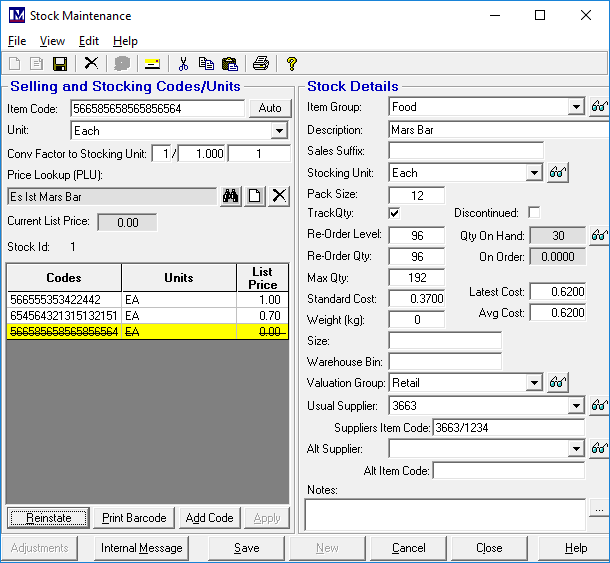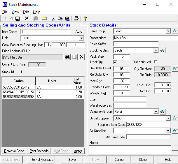 The ‘Stock Maintenance’ screen will now open for this stock item.