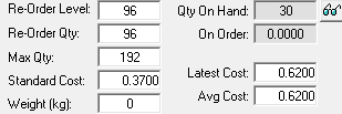 This is the stock level at which you want to re-order this item. N.B. the software will not warn you, or automatically send an order for you when your stock goes below this level. There is a report to show you stock items that have fallen below this level (the ‘Stock Re-Order Report’.) and in the ‘Purchase Order’ module there is the ability to generate an order for stock items that have fallen below this level.
